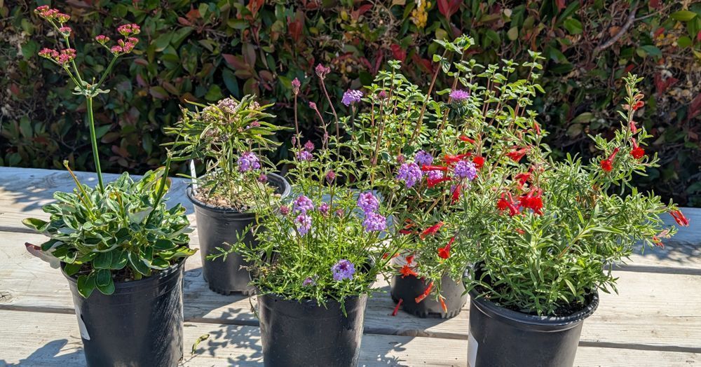 We will have a sale on Saturday, July 12, 10am to 1pm. We’re featuring some beautiful California natives that bloom over a long period: (left to right in the photo) Red-flowered Buckwheat, Narrow Leaf Milkweed, De la Mina Verbena, Russian River Coyote Mint, and California Fuchsia. We have a variety of perennials and shrubs including monkeyflower, yarrow, ceanothus, asters, buckwheats, wallflower, native strawberries, island alum root, wax myrtle, bee’s bliss sage, golden-eyed grass, and more. We also have succulents, cymbidium orchids and other ornamental plants. Location: Casa de Flores at 737 Walnut Street in San Carlos.